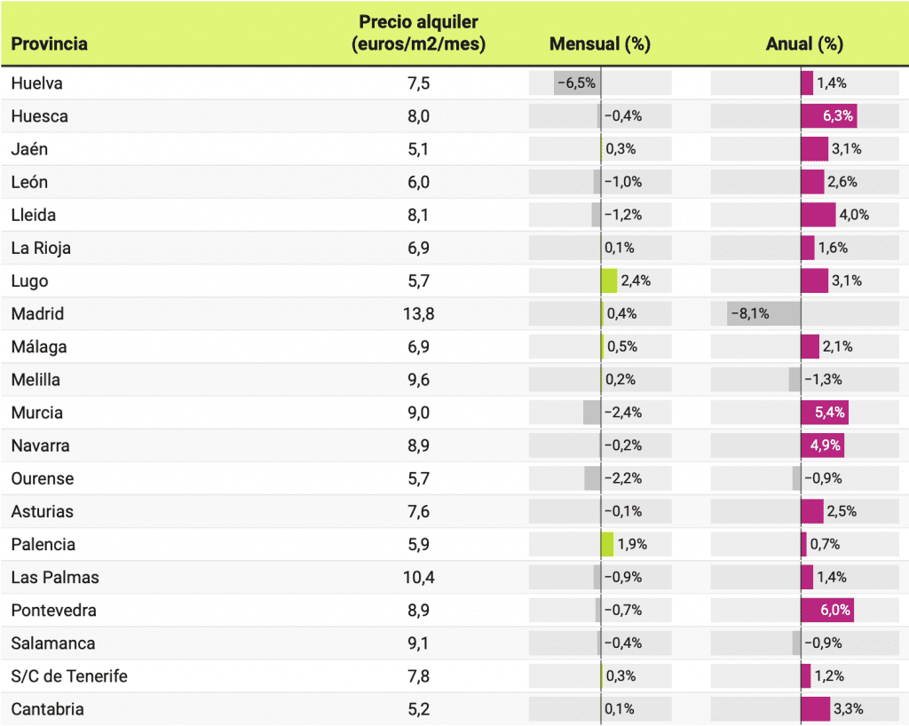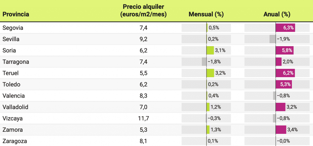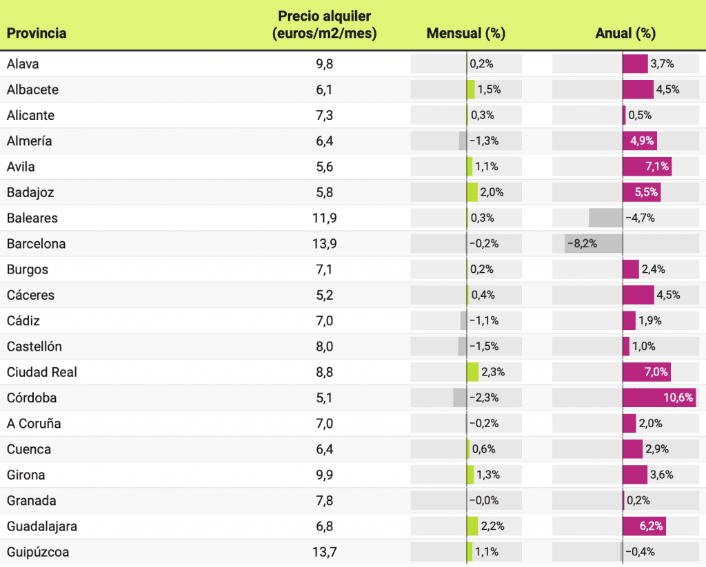 Le prix ne baisse que dans 11 provinces par rapport à ceux enregistrés il y a un an. Les plus fortes baisses ont été enregistrées dans les provinces de Barcelone (-8,2%), Madrid (-8,1%), les îles Baléares (-4,7%), Séville (-1,9%) et Malaga (-1 ,3%). D’autre part, les plus fortes augmentations des loyers de l’année dernière ont eu lieu dans les provinces de Cuenca (10,6%), Ávila (7,1%), Cantabrie (7%), Ségovie (6,3%) et Huesca (6,3%).