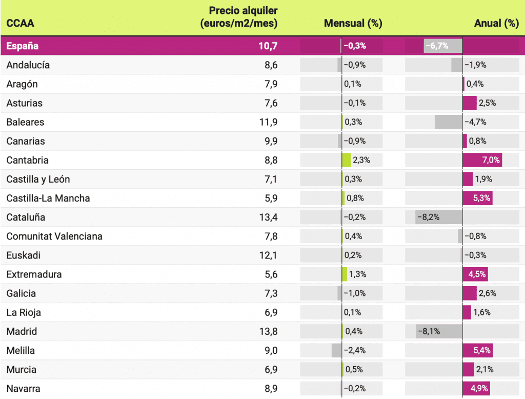 Le prix de location moyen des logements a diminué dans 6 régions autonomes au cours de la dernière année. La Catalogne (-8,2%), la Communauté de Madrid (-8,1%) et les îles Baléares (-4,7%) ont mené les baisses, suivies de l’Andalousie (-1,9%), de la Communauté de Valence (-0, 8%) et d’Euskadi (-0,3%). En revanche, les loyers des logements locatifs ont augmenté au cours des douze derniers mois en Cantabrie (7%), Castilla-La Mancha (5,3%), Navarre (4,9%) et Estrémadure (4,5%). Au-dessous de 3% sont les augmentations en Galice (2,6%). Asturies (2,5%), Région de Murcie (2,1%), Castilla y León (1,9%), La Rioja (1,6%), Canarias (0,8%) et Aragon (0,4%).