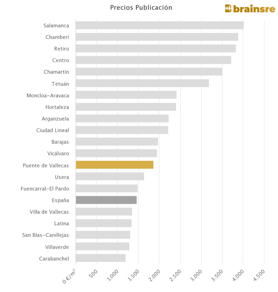Idem pour les bureaux. Selon les données de Brainsre, les prix des bureaux dans le quartier correspondant à cette zone -Puente de Vallecas- sont au bas du classement de la capitale, devant le quartier d’Arganzuela, où de grandes entreprises comme les grandes entreprises ont récemment implanté leur Repsol, créant une zone financière de référence, avec des bâtiments nouvellement construits.