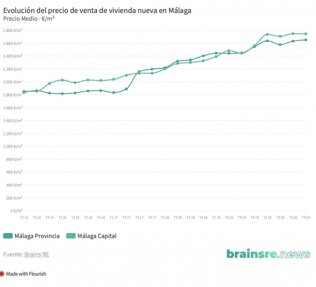 Même si le prix moyen de la maison neuve dans la capitale de Malaga était de 2741 euros le mètre carré dans le dernier quart de travail, montant similaire enregistré au trimestre précédent et 0,3% mais le prix constaté entre mars et 2020.