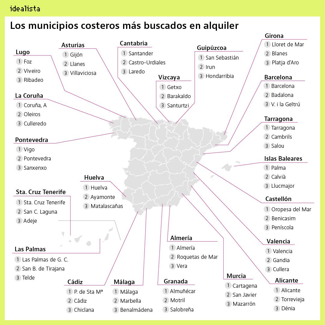 Mais il existe d’autres provinces où les communes avec le plus grand intérêt pour la location sont directement des références touristiques, dans certains cas parce que leur capitale n’est pas une commune côtière comme Lloret de Mar (Gérone), Carthagène (Murcie), Almuñécar (Grenade) ou Foz à Lugo.