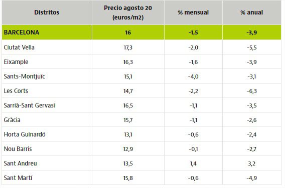 Les quartiers de Barcelone qui ont le plus remarqué la baisse des revenus locatifs l’année dernière sont Les Corts (-6,3% sur un an), Ciutat Vella (-5,5%) et Sant Martí (-4,9% ), bien qu’il soit à noter que le quartier de Sant Andreu est le seul à enregistrer des augmentations entre août de cette année et août 2019, avec une augmentation de 3,2%.
