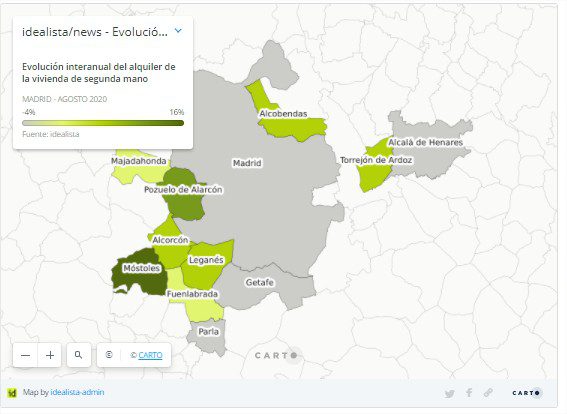 Mais si l’on passe à la variation mensuelle des loyers, il y a six augmentations et six baisses. Les augmentations les plus importantes ont été observées à Las Rozas (3,6%), Torrejón de Ardoz (1,9%) ou Fuenlabrada (0,6%), tandis que des chutes ont été observées à Majadahonda et Parla (toutes deux avec -3,6 %), Getafe (-2,1%) ou Alcorcón (-1,2%).