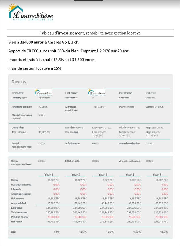 Ensuite s’ajouteront les frais d’entretien : IBI taxe foncière et d’habitation : 500 Euros annuels, charges de communauté 120 euros par mois soit 1440 euros annuels.
