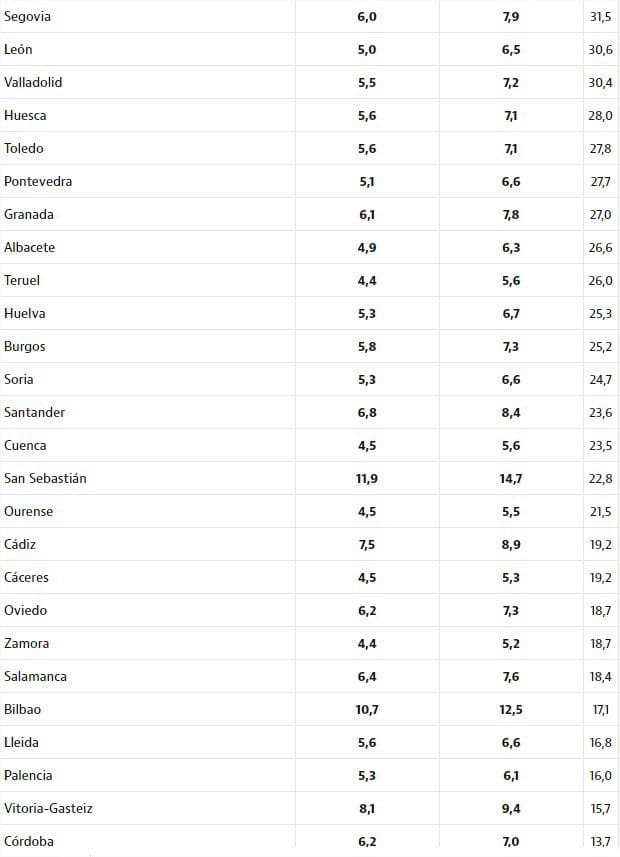 Mais d’autres villes, telles que Castellón (16,7 %), Pampelune (10,4 %), Gérone (11,5 %) ou Murcie (10,3 %) déjà mentionnées, ont connu des augmentations à deux chiffres.