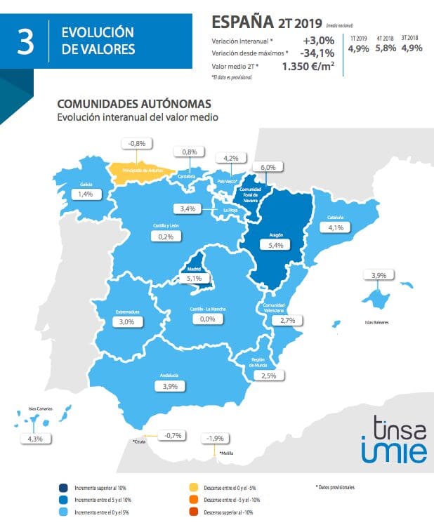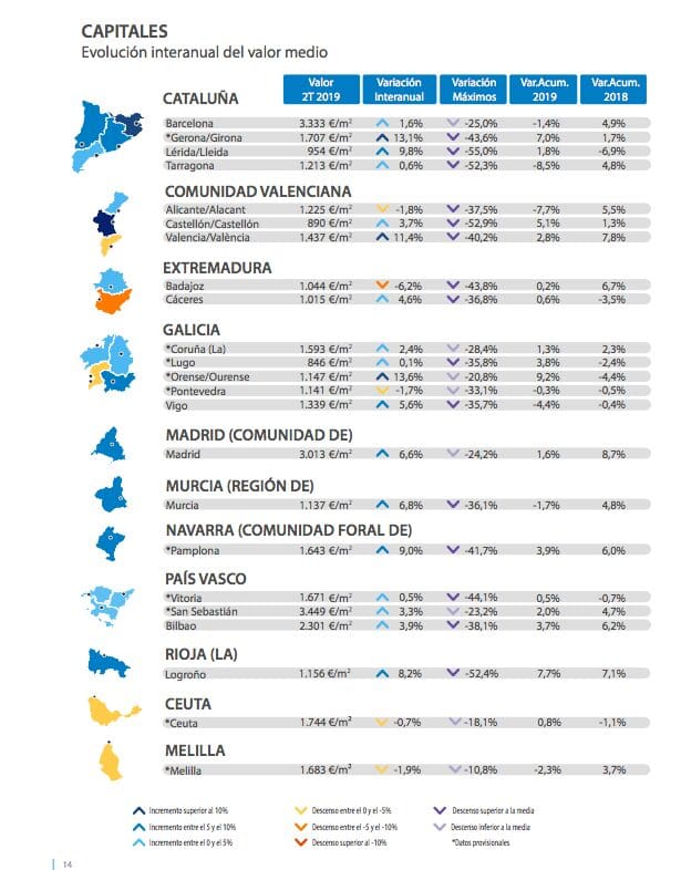 Le chiffre provisoire du rapport Tinsa IMIE Marchés Locaux pour le deuxième trimestre 2019 indique une augmentation de 3% annuel du prix moyen des logements finis (neufs et d’occasion) en Espagne, ce qui correspond à une valeur moyenne de 1.350 € / m2. Parmi les principales capitales provinciales et seule Valence, sa valeur moyenne dépasse les 10%, bien que Palma de Majorque, Saragosse et Séville varient de plus de 8%. Madrid et surtout Barcelone montrent des signes évidents de stabilisation, laissant la variation nationale trimestrielle de la valeur moyenne inférieure à 1%.