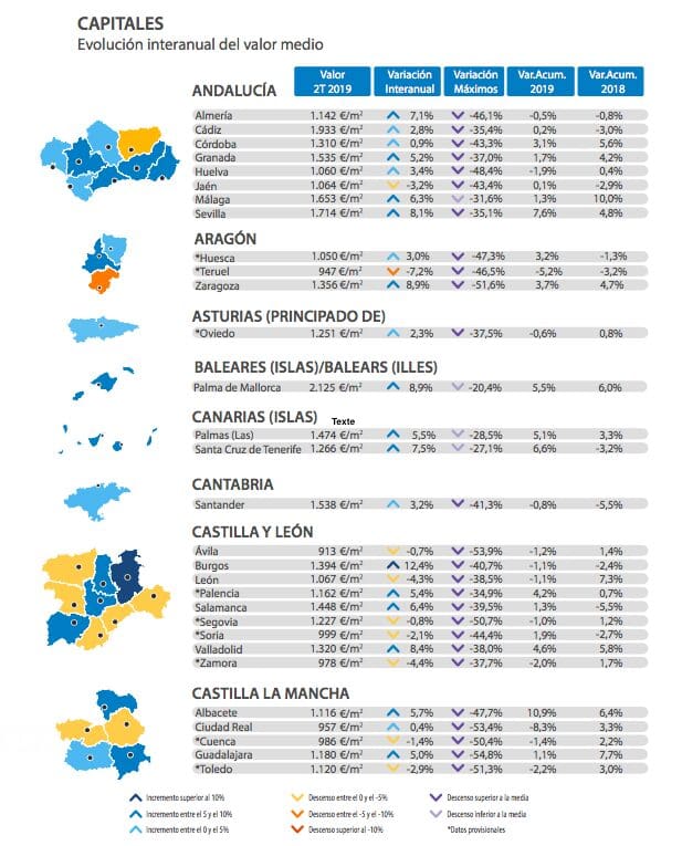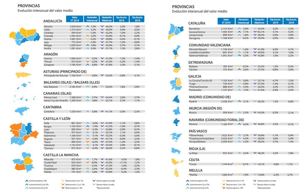Les valeurs provinciales les plus élevées sont observées à Guipúzcoa (2 432 € / m2), à Madrid (2 336 € / m2), aux Baléares (2 183 € / m2), à Barcelone (2 153 € / m2) et à Vizcaya (2 059 € / m2). Les moins élevées se situent à Ciudad Real (633 € / m2), Teruel (673 € / m2), Cuenca (679 € / m2) et Lugo (736 € / m2).