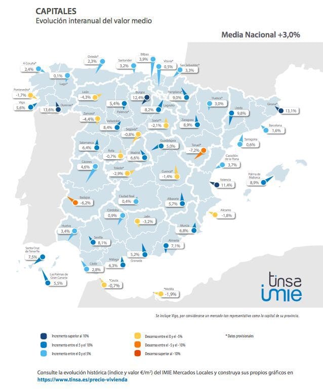 Quatre capitales de province enregistrent des augmentations annuelles de plus de 10%: Valence, Orense, Gérone et Burgos. Les deux grandes capitales, Madrid et Barcelone, réduisent considérablement leurs augmentations passées. La première augmente chaque année de 6,6% et la Ciudad Condal de 1,6% (dans ce cas, la baisse trimestrielle est de 1,7%). Quatorze capitales – si l’on inclut Ceuta et Melilla – connaissent des baisses par rapport à la même période de l’année précédente.