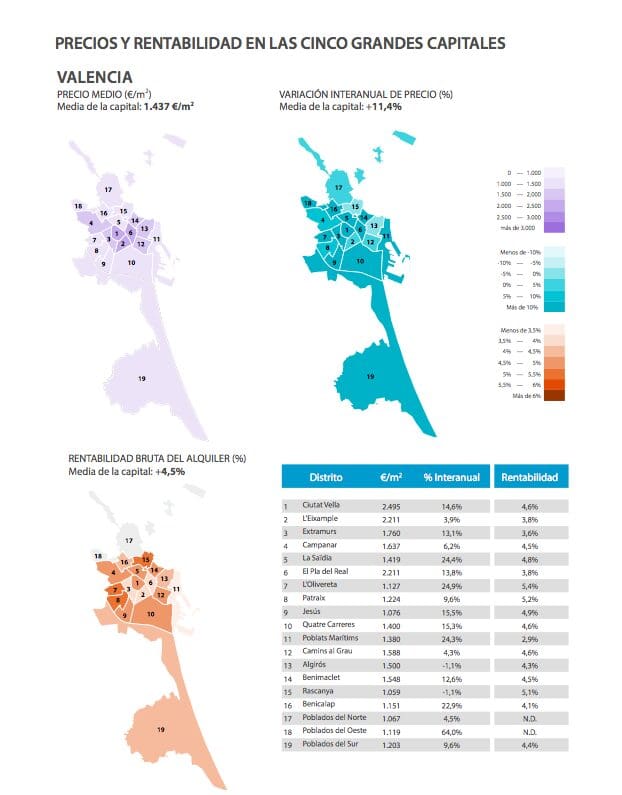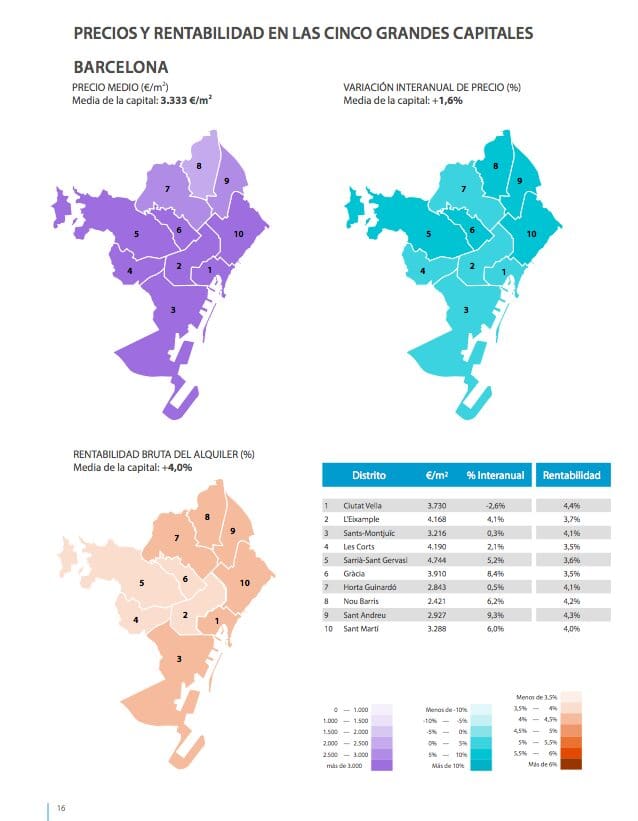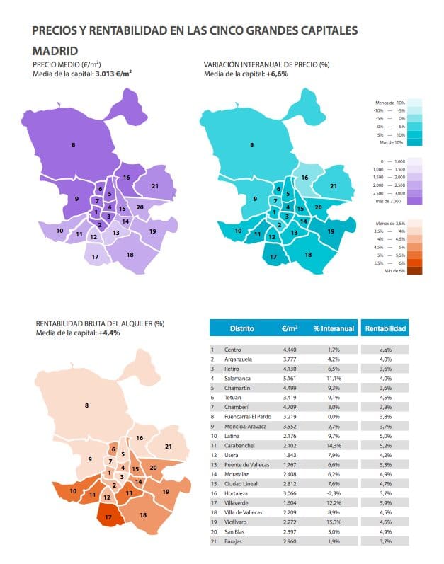 Les quartiers les plus chers, situés à Madrid et à Barcelone et avec des chiffres supérieurs à 4 000 € / m2, sont ceux de Salamanque, Chamberí, Retiro, Centro et Chamartín (Madrid), et Sarrià-Sant Gervasi, Eixample et Les Corts (Barcelone).