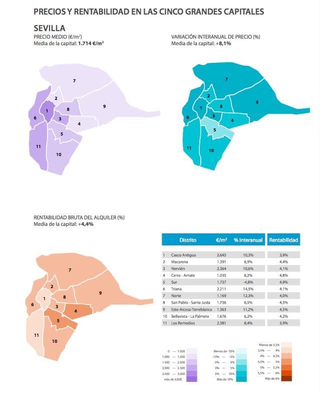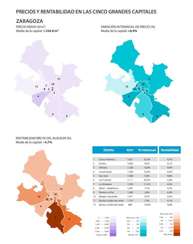 La tendance générale à la hausse de la croissance annuelle dans les districts périphériques des trois principales villes – Madrid, Barcelone et Valence – se poursuit, tandis qu’à Saragosse et à Séville, l’augmentation la plus notable est encore enregistrée dans les districts du centre.