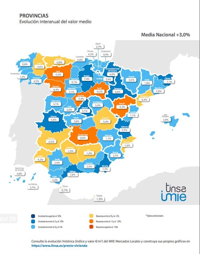 Au cours de ce trimestre, il n’ya plus d’augmentation annuelle de plus de 10% dans aucune province, avec neuf d’entre elles augmentant entre 5% et 8%, parmi lesquelles Malaga, Valence et Madrid.