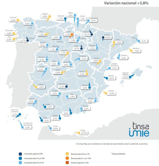 Les augmentations annuelles à deux chiffres dans les principales capitales provinciales ne sont plus notables. Valence et Palma de Majorque se maintiennent avec des chiffres supérieurs à 8%, Séville et Malaga un peu plus de 5% et Saragosse 3,2%. En ce qui concerne les deux plus grandes villes, Madrid affiche une augmentation de 3% et Barcelone affiche une valeur moyenne inférieure de 1% à celle du troisième trimestre de 2018.