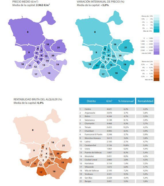 Les quartiers les plus chers, situés à Madrid et Barcelone, avec des chiffres supérieurs à 4.000 € / m2 , sont ceux de Salamanca, Chamberí, Centro, Chamartín et Retiro (Madrid), et Sarrià-Sant Gervasi, Les Corts et Eixample (Barcelone).