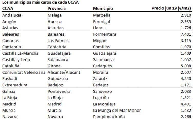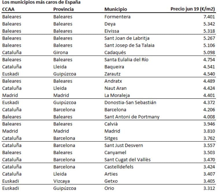 Le podium des 5 communes les plus chères est complété par 4 autres villes des Baléares: Deya (5 342 euros / m2), Eivissa (5 318 euros / m2), Sant Joan de Labritja (5.267 euros / m2) et Sant Josep de Sa Talaia (5.106). euros / m2).