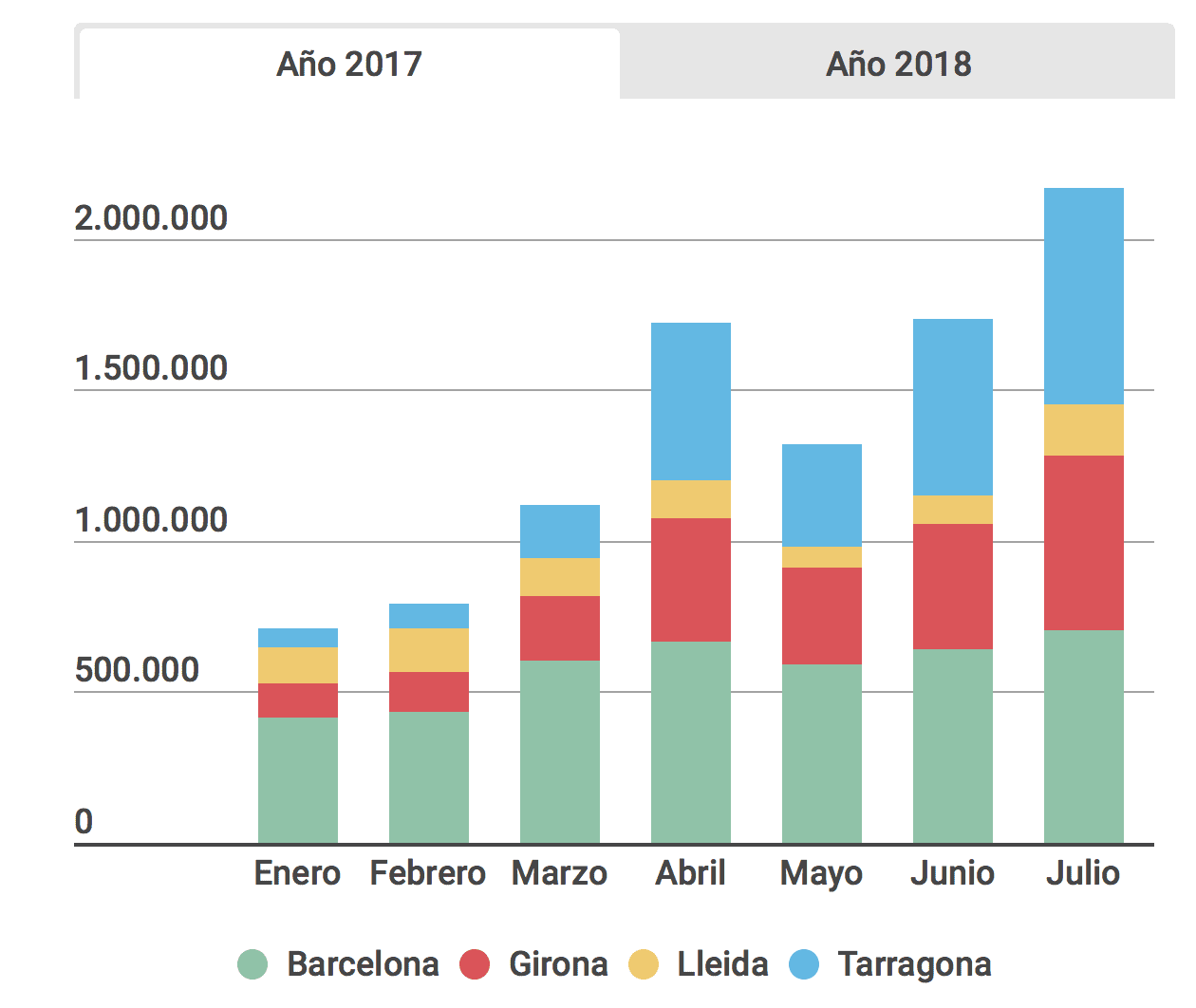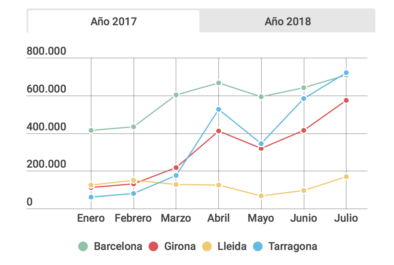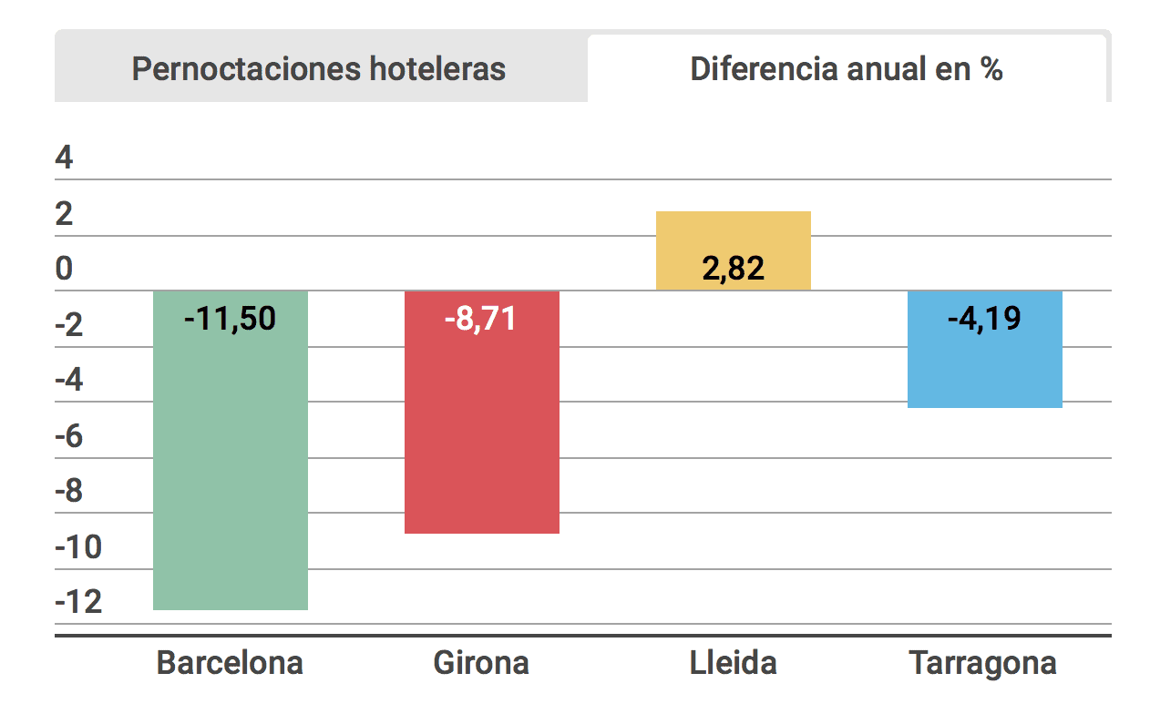 Cependant, cette baisse n’est pas homogène dans toutes les destinations mais se concentre principalement dans deux provinces: Barcelone (-9,87%) et Tarragone (-8%). En revanche, dans la région de Gérone, il n’y a guère eu de baisse (-0,4%) et dans les comtés de Lleida, il y a même eu une croissance de 4,7%. Cependant, lorsque le mois de juillet est arrivé, les chutes étaient plus répandues. Dans l’infographie interactive suivante, nous pouvons visualiser les données plus en détail. De janvier à juillet, les hôtels en Catalogne ont perdu au total un million de nuitées de voyageurs étrangers et espagnols par rapport à la même période l’an dernier.