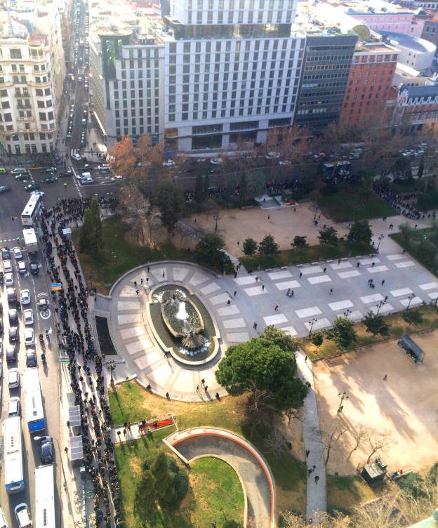 La queue d’environ 500 mètres, selon les photos, s’étend de la rue Princesa, contourne le parc, et continue jusqu’à la rue Bailén, Les milliers de personnes qui attendent tiennent entre leurs mains des CV et des lettres de motivations. A la clé de cette interminable file d’attente : 100 offres d’emploi à pourvoir dans un hôtel installé depuis peu dans le centre-ville de Madrid. L’hôtel a convoqué les candidats pour un “casting”, selon ses propres mots, entre 10 heures et 17 heures aujourd’hui. Certains candidats commençaient déjà à abandonner la course en fin de matinée, epuisé par l’attente.