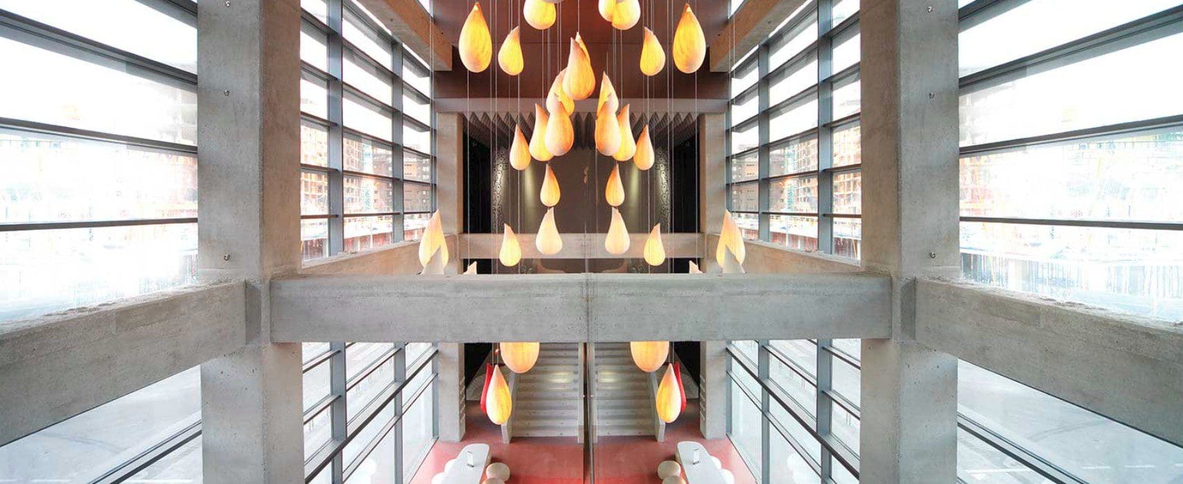 D’une hauteur de six mètres, le toboggan en acier (autrement appelé EDHA : structure glissante pour personnes audacieuses) est au cœur de la réception qui se remarque aussi grâce à l’utilisation de couleurs acidulées. Il relie le premier étage et l’entrée de l’hôtel. Le lobby du Barceló Málaga ne surprend pas que les voyageurs de passage, il a en effet été reconnu par plusieurs prix, dont celui, en avril dernier, de la Lettre d’argent pour la meilleure enseigne en design d’intérieur.
