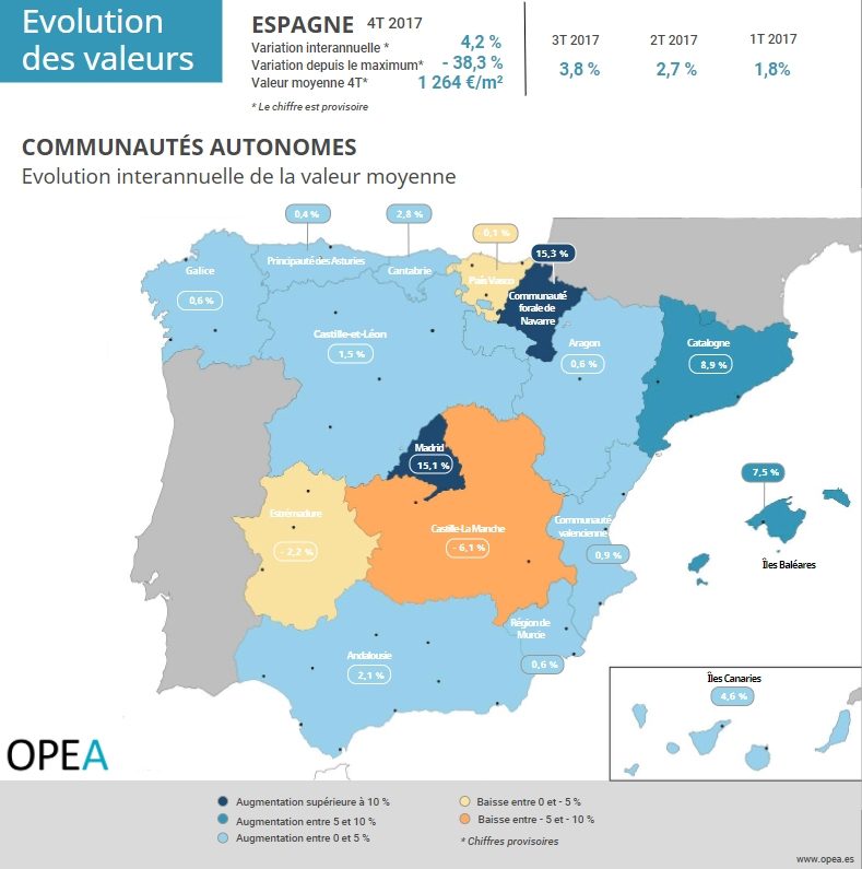 En tête des communautés, avec 2 082 euros par mètre carré, Madrid est la région avec la valeur moyenne la plus élevée. Les Îles Baléares (2023 euros par mètre carré), le Pays Basque (1 992 euros par mètre carré) et la Catalogne (1 770 euros par mètre carré) constituent le panel des régions les plus valorisées au dernier trimestre 2017.
