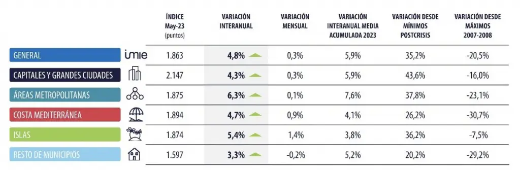 Statistiques mensuelles de Tinsa IMIE pour le mois de mai, analysant l’évolution des logements neufs et d’occasion dans cinq grandes zones de marché: les capitales, la côte méditerranéenne, les îles, les zones métropolitaines et les autres municipalités. > L’indice général augmente de trois dixièmes de point de pourcentage au cours du dernier mois et confirme la tendance...